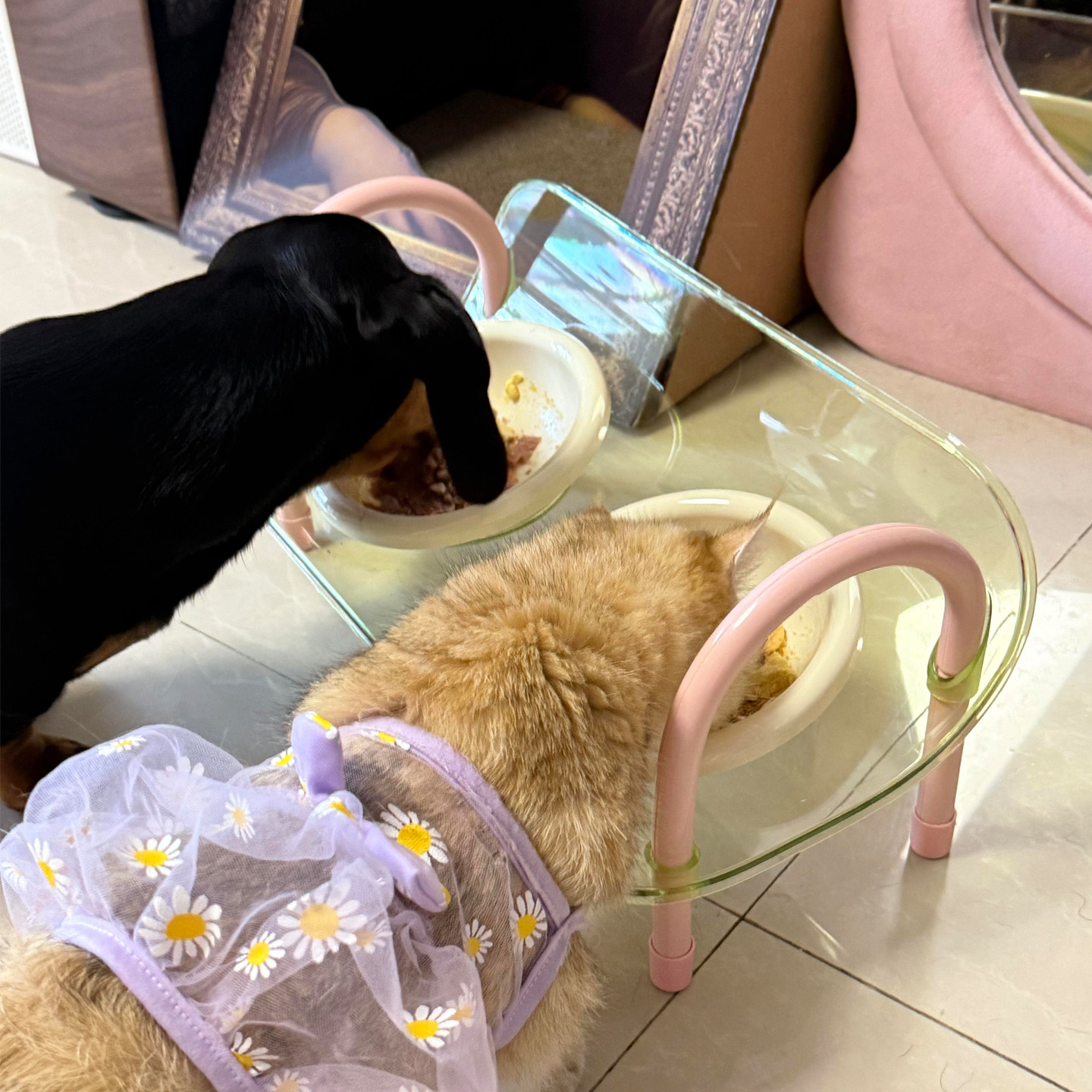 This raised double pet bowl set features a sturdy acrylic holder paired with two smooth ceramic bowls for food and water. The elevated design helps keep bowls at a comfortable height for everyday feeding, while the stable base supports regular use in indoor spaces. The removable ceramic bowls are easy to clean and suitable for serving dry food, wet food, or water. Designed for cats and small to medium dogs, this bowl set offers a clean, organized feeding solution that fits naturally into daily pet routines.